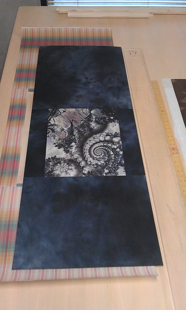 ムラ染の和紙で囲む事でフラクタル模様が本紙の外に滲み出て、