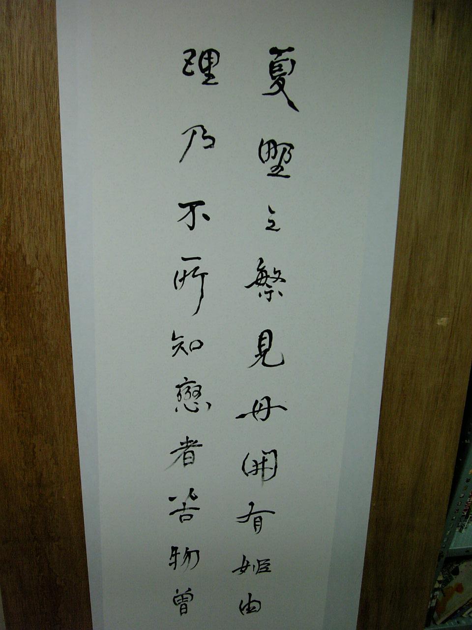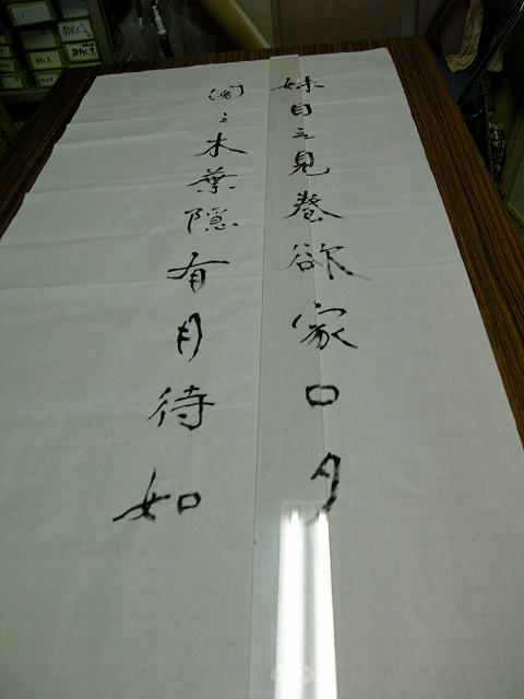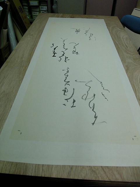 塗りおえたら本紙の上にゆっくりと寝かせます。一度本紙に付いた部分を剥がして置き直そうとすると本紙が一緒にくっついてくる事があるのでやめましょう。大きな作品になると一度で正確に位置合わせをするのは難しくなってくるので、予め裏打紙の短い方の一辺を台に糊かテープで貼って固定しておくとよいでしょう。その離れない一辺の向かい側を持って反対側にまわり、軽く引っぱって紙をピンと伸ばした状態でゆっくりと下に下ろすとよい感じでした。
