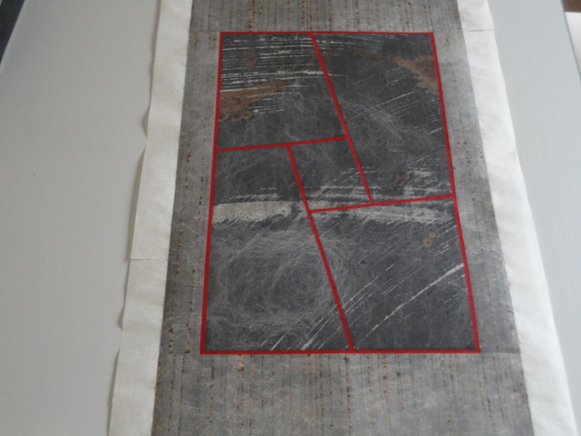 細い帯状の部分を残して紙を切り抜き、右側の半分はクルッと裏返して張っています。
