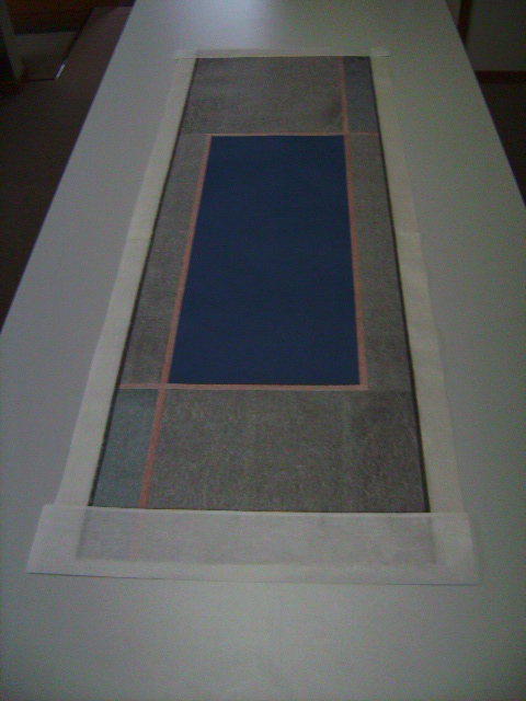 一枚だけで掛け軸全面を覆う事はできないので継ぎが必要になります。前回書いた喰い裂きという方法で継ぎ目が目立たないようにしてあります。写真ではまだ水分が飛んでいないので継ぎ目が3カ所見えますね。