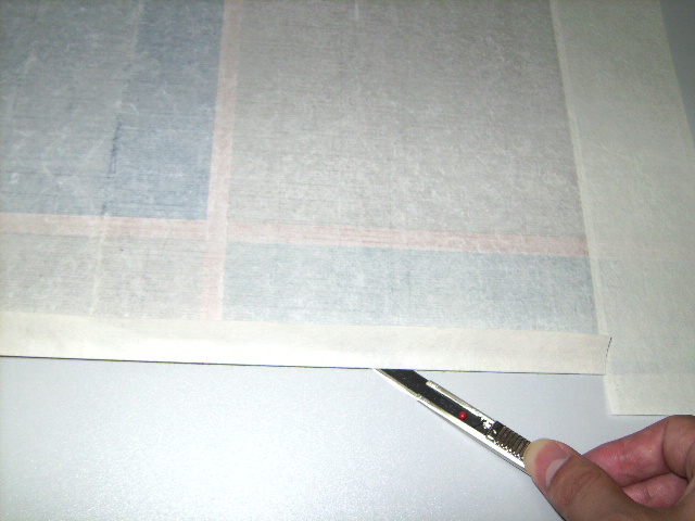 裏打ちを継ぐ時などにも喰い裂きを使います。直線で切り継ぐ時に比べて継ぎ目が目立たなくなります。