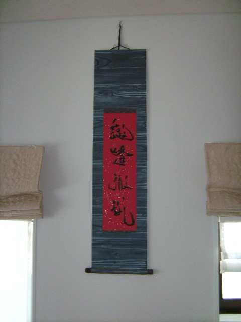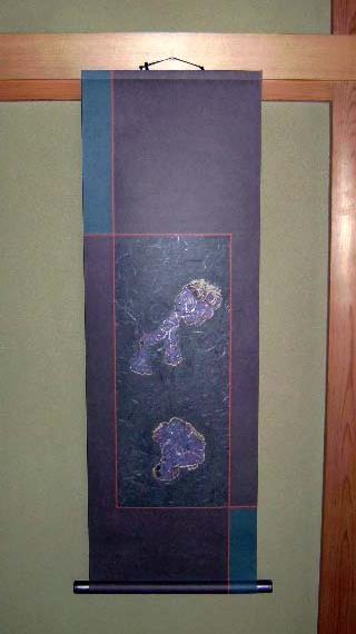 見えづらいけど本紙の上下に金襴(金糸が入った裂地)を使って装飾してます。この部分の事を一文字っていいます。周りの紙は板目模様の和紙。変則的に軸先を使わず、焼き焦がしてこれまた木目を出した杉の木を軸棒として使いました。(実は素材を買いに行った時に軸先買うのを忘れてて、即興的に思いついて勢いで作ったのだけどw)案外いい感じに仕上がった気がします。